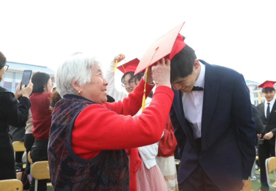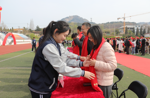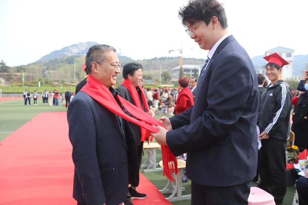 在合唱朗诵《师者如光》的精彩演绎中,家长们亲手为孩子戴上象征成熟与责任的“成人帽”;同学们则为班主任系上寓意感恩的“红围巾”,感谢老师们一路以来的悉心陪伴与谆谆教诲。温情脉脉间,浓浓亲情与深厚师生情交织相融,温暖了全场。